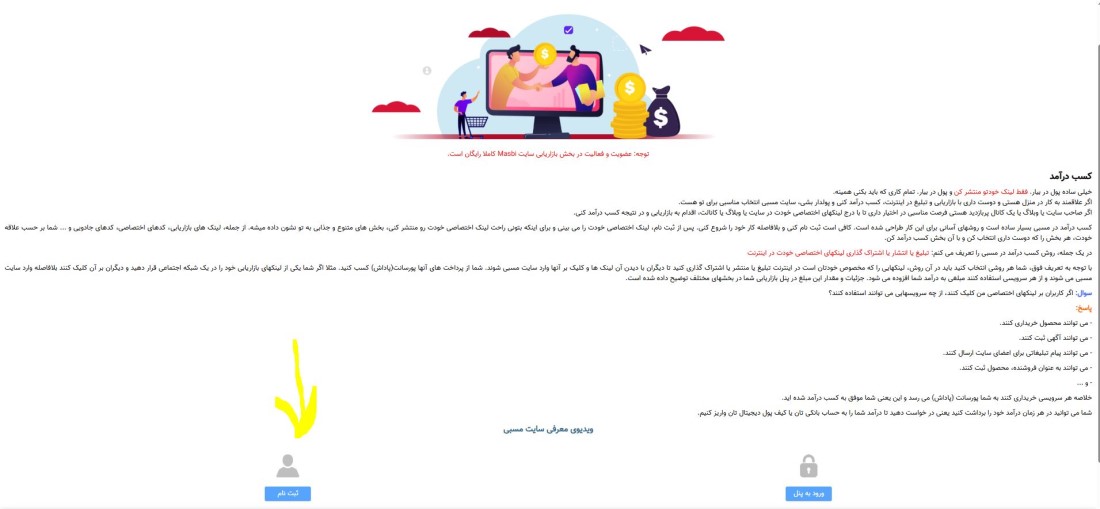 پس از ورود و ثبت نام به سایت در صورت اینکه قصد دارید کسب درآمد کنید از قسمت بازاریابی وارد و مراحل را طبق آموزش انجام می دهید و در صورت اینکه فروشنده هستید و محصولی برای فروش دارید در قسمت محصولات من و سپس ثبت محصول جدید را کیلک کرده و طبق روال مراحل را ادامه می دهید.